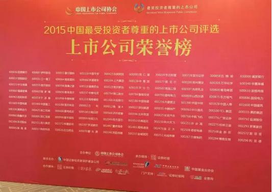 凭借优秀的公司治理能力、良好的投资者关系管理机制,从近2800家上市公司中脱颖而出,荣获“2015中国最受投资者尊重的百家上市公司”奖项。