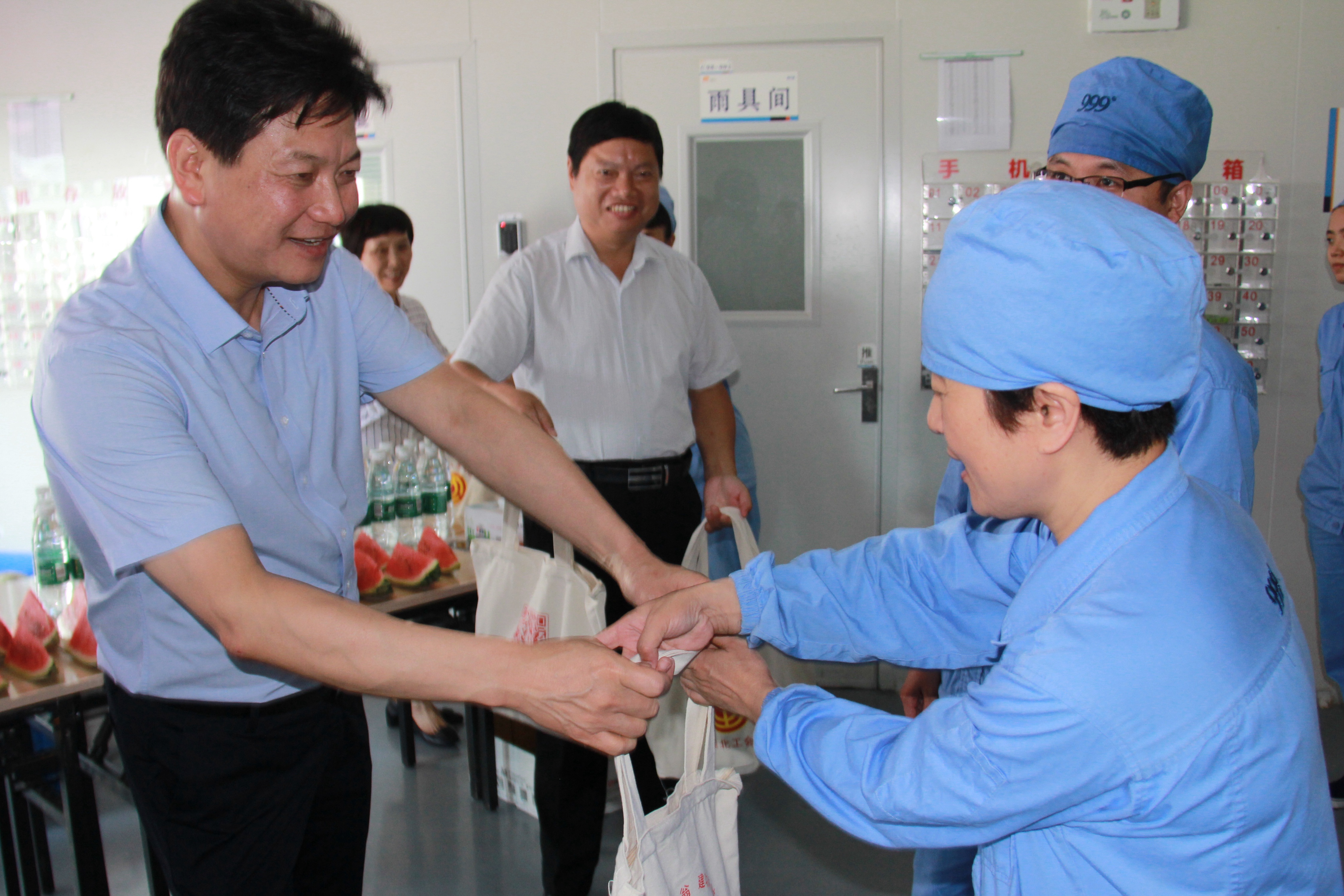 7月31日上午,淮北市委副书记李明,市人大常委会副主任、市总工会主席李晓光一行,来到安徽华润金蟾药业股份有限公司,开展“暑期送清凉”慰问活动,慰问在高温下坚守生产岗位的一线职工。