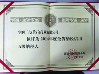 A级纳税信用等级是企业最好的信用证明。黄石三九获得此项荣誉,是税务部门对我公司经营坚持遵纪守法,诚信纳税的充分肯定,同时也将对公司快速健康持续的发展、增强市场竞争力、树立良好的市场信誉起着显著的促进作用。