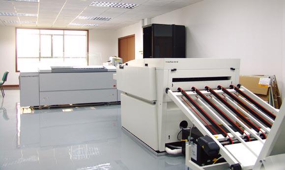 整套的印前制版系统、盒样机及先进的软件,引进世界上最先进的CTP,实现了从设计到出盒型、从设计到输出PS版的一体化流程;先进的色彩管理系统,可将印刷、数码打印和电脑色彩保持一致,使所见即所得。设备:CTF、CTP、柔版制版机、宽幅打印机、盒样机、GMG数码色彩管理系统。